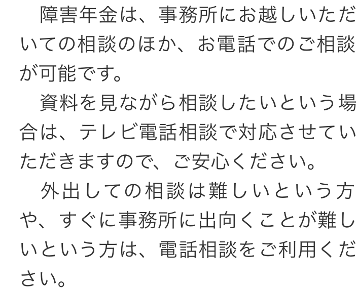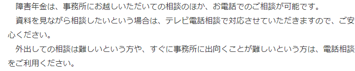 さらに、障害年金については、電話やオンラインでの相談にも対応しており、自宅から気軽に相談できる環境も整えております。