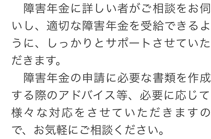 トップお役立ち情報障害年金を受給するためのポイント 階層構造▼ お役立ち情報(目次) 障害年金を受給するためのポイント1 障害認定基準の内容に適合2 診断書が重要3 専門家に相談 1 障害認定基準の内容に適合2 診断書が重要3 専門家に相談 お役立ち情報(目次)お役立ち情報トップ障害年金の相談窓口障害年金を受給するためのポイント障害年金で必要な書類不支給通知が届いた場合障害年金に所得制限はあるのか働きながら障害年金を受給できる場合障害年金の種類関節リウマチで障害年金を申請する場合のポイント額改定請求について障害者手帳について 受付時間 平日 9時~21時、土日祝 9時~18時 夜間・土日祝の相談も対応します (要予約) 所在地 〒120-0034 東京都足立区千住2-4オカバツインタワービル イースト5F 0120-25-2403 お問合せ・アクセス・地図