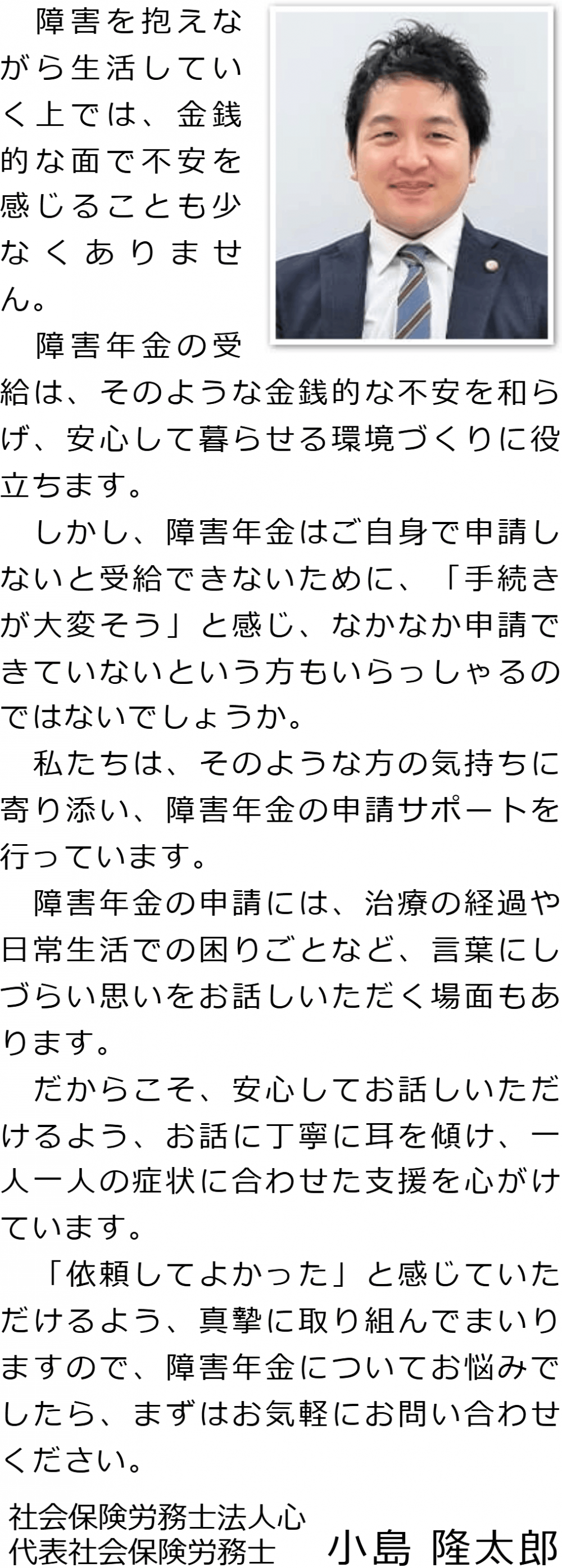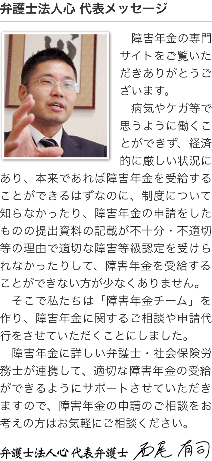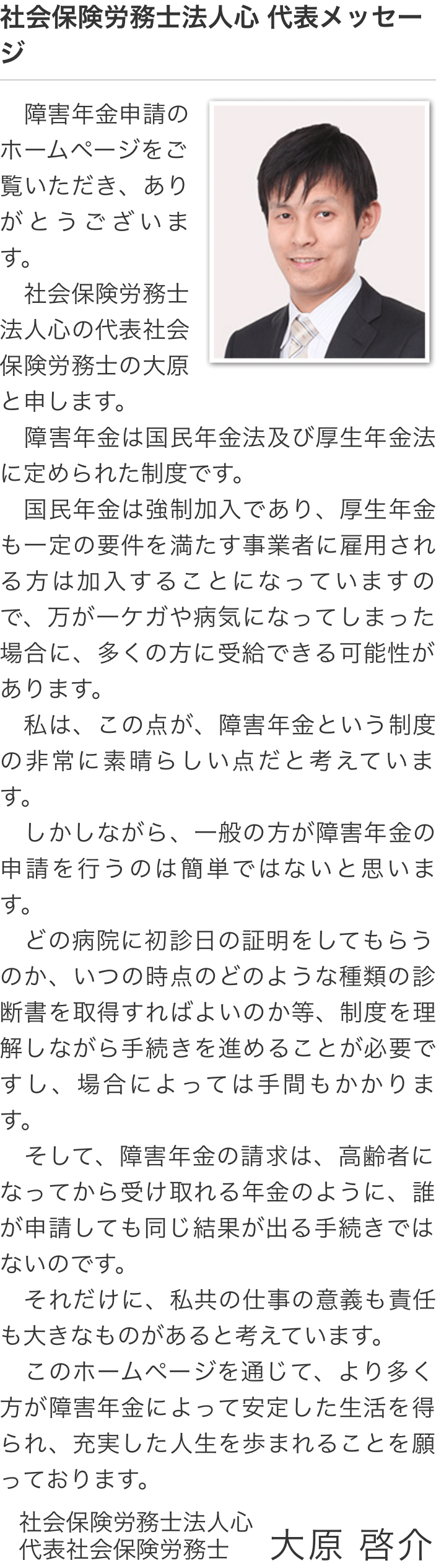 トップその他代表メッセージ 階層構造▼ その他(目次) 代表メッセージ その他(目次)その他トップ共通バナー※消さない障害年金無料診断サービス初めて障害年金を申請の方へ手続きの流れ代表メッセージ電話・テレビ電話相談について電話・テレビ電話相談の流れ心グループニュース(新着情報)お客様相談室費用の安さにこだわる理由関連リンクプライバシーポリシー 受付時間 平日 9時~21時、土日祝 9時~18時 夜間・土日祝の相談も対応します (要予約) 所在地 〒120-0034 東京都足立区千住2-4オカバツインタワービル イースト5F 0120-25-2403 お問合せ・アクセス・地図